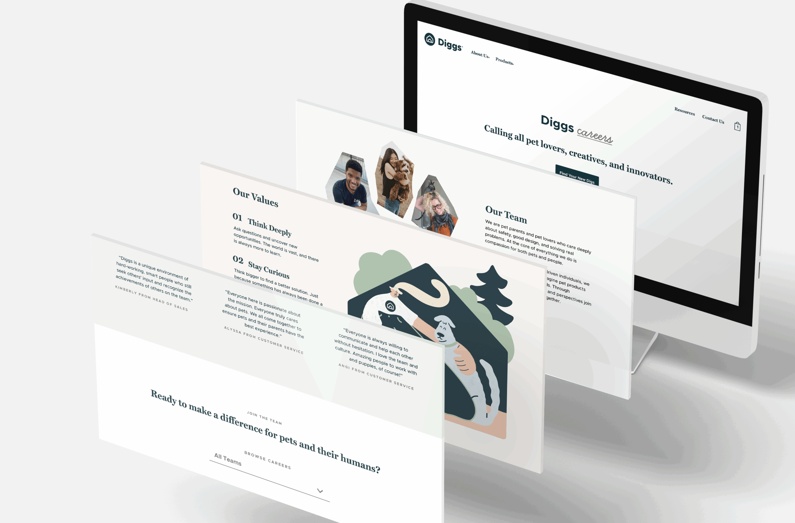 I designed a responsive, modular Careers Page for Diggs that aligned with the brand’s playful yet elevated visual identity. The page needed to highlight company values, benefits, and open roles while maintaining visual consistency with the existing website. My work included responsive layouts for desktop, tablet, and mobile — plus marketing visuals like product graphics for email and social.